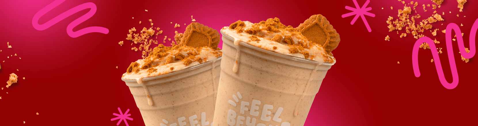 A festive smoothie made with cookie butter, low fat frozen yogurt, cinnamon, banana, honey, almond milk, and almond butter. Topped with cookie crumbs!