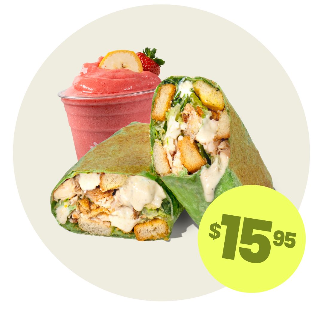 Duo Deal: Chicken Caesar Wrap on a Spinach Tortilla served with your choice of a 12oz Total Energy or Mango Tango.