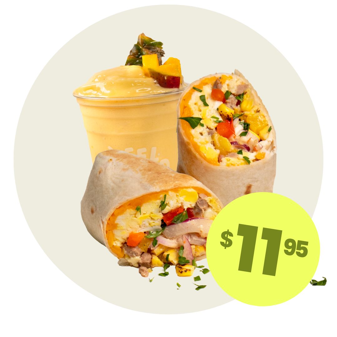 Duo Deal: Chicken Sausage & Egg Breakfast Burrito on a Flour Tortilla served with your choice of a 12oz Total Energy or Mango Tango. (*Select locations offer a Veggie Sausage & Egg Burrito + Smoothie Duo Deal)